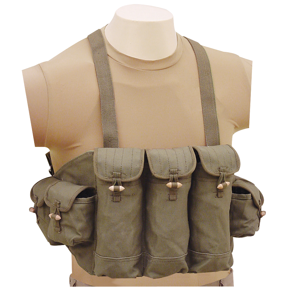 A vintage 7-pocket rig designed to hold AK-47 magazines, loose rounds, etc. Three tall center pouches measure 3"L x 2"W x 9"H. The four side pouches (2 on each side), measure 3"L x 2"W x 3½"H. All pouches have flap covers with wood toggle closures. Heavy adjustable canvas webbing shoulder straps have leather keepers. A vintage find! Good - Used Condition.