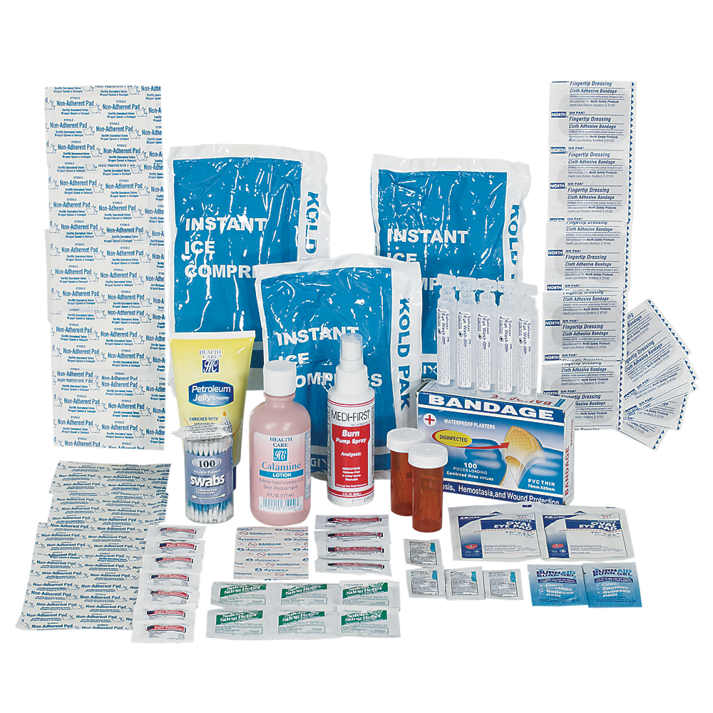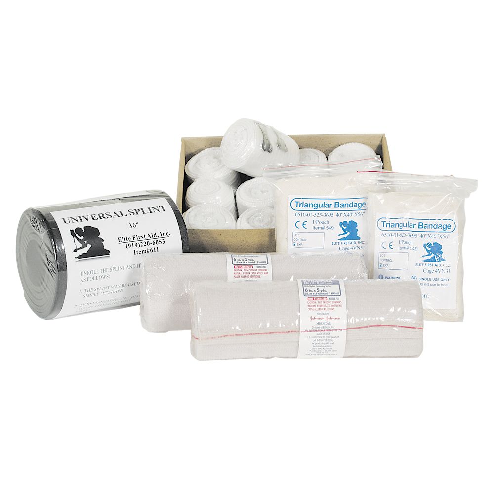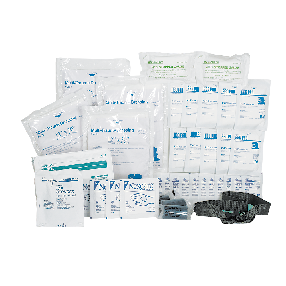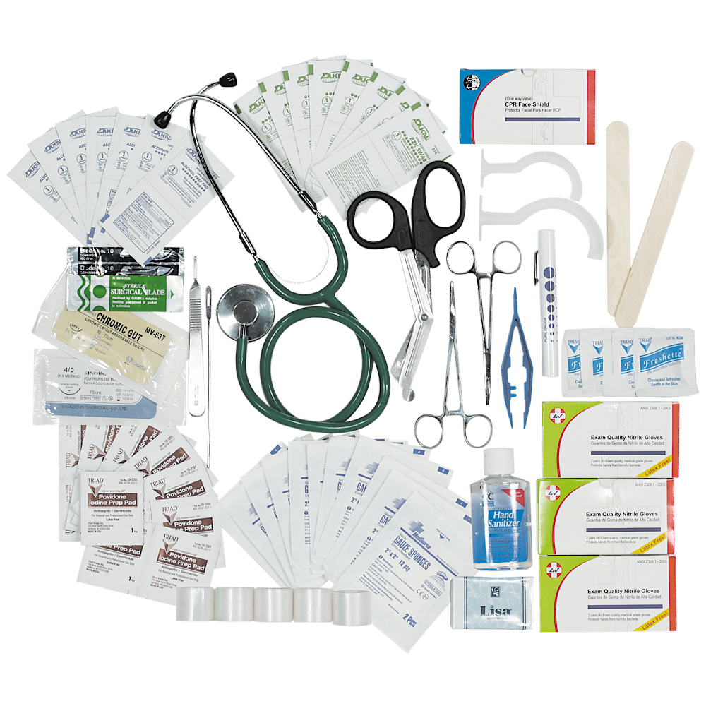 - 1 of each: Skin Probe, Hand Sanitizer, Scalpel Handle #3, Hand Soap, Calamine Lotion, 6oz., Pen Light, Burn Spray, SAM Splint, EFA - First Aid Book, Tourniquet, Stethoscope, Lip Treatment, CPR Mask, EMT Shears, 7.25'', Pai